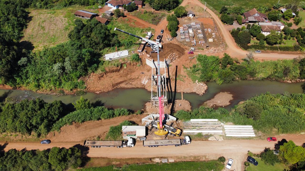 Uma grande operação envolvendo equipes das empresas DG Participações e Sansão Guindastes concluiu no último sábado (11) mais uma etapa na reconstrução da ponte ‘Passo Fundo’, no Arroio Sampaio, divisa entre Mato Leitão e Cruzeiro do Sul.