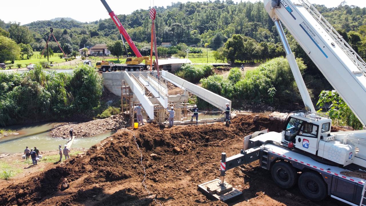 A reconstrução da ponte avançou para uma etapa decisiva após quase dois anos da enchente histórica de 2024. As empresas instalaram as vigas da superestrutura, uma das fases mais complexas e importantes do projeto. O serviço do guindaste foi contratado pela Prefeitura de Mato Leitão que também auxiliou com máquinas para preparar o terreno.